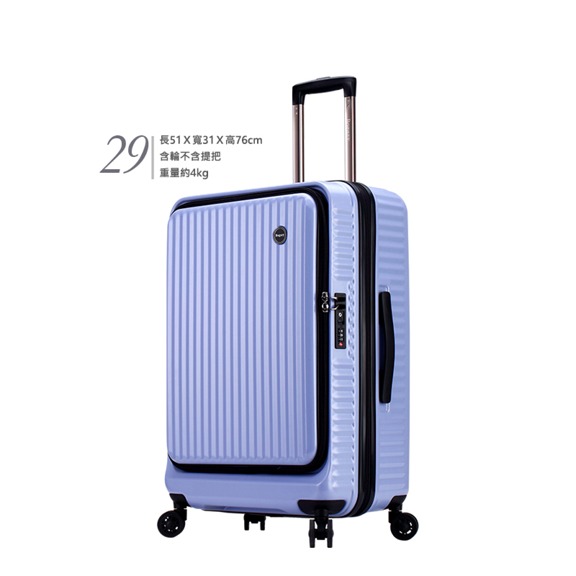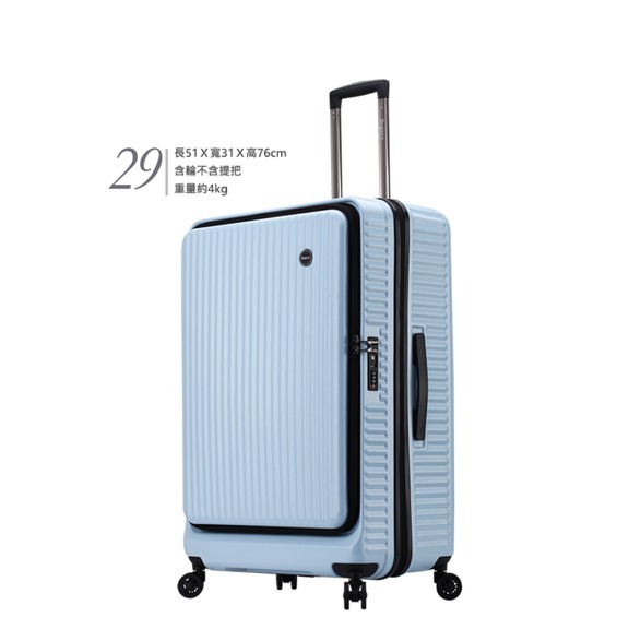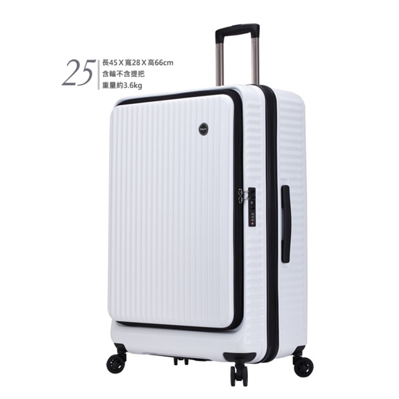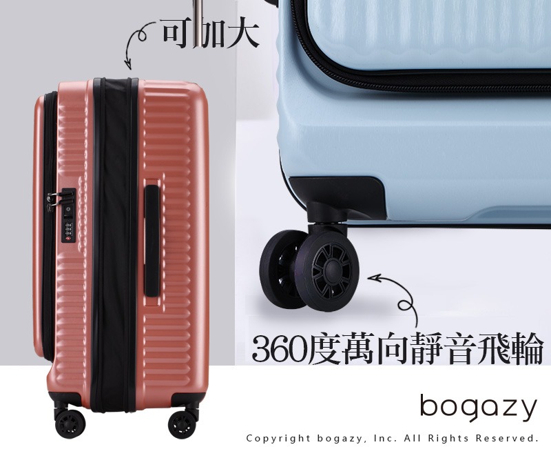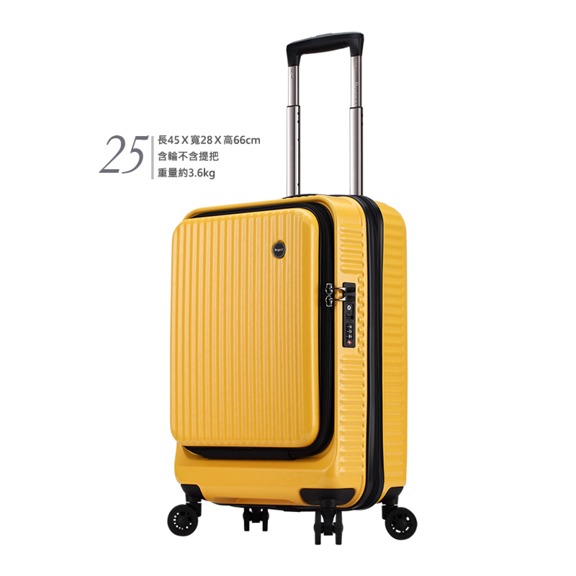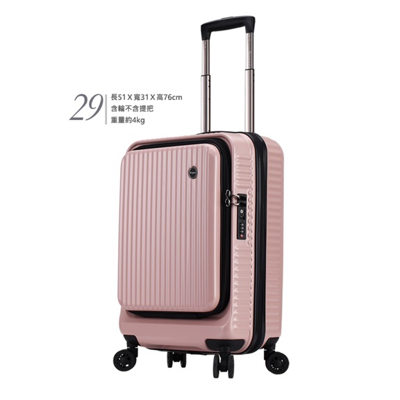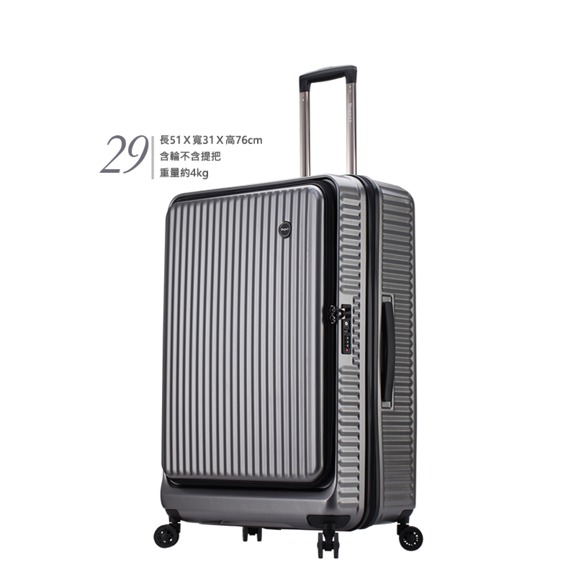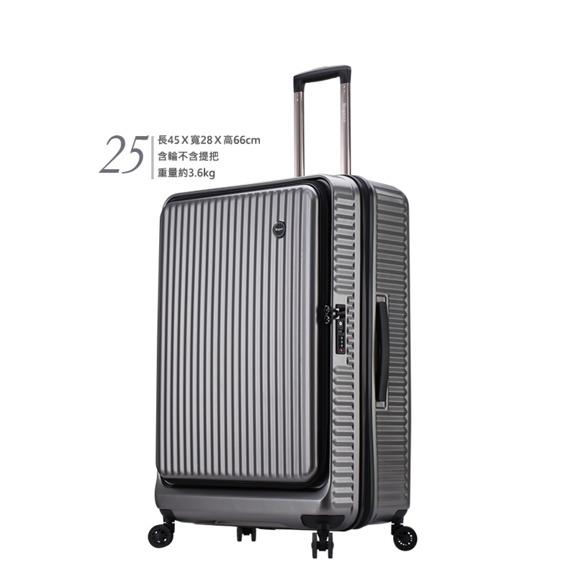 360度萬向靜音飛輪。多段式鋁合金拉桿,使用全球通用TSA國際海關密碼鎖,崁入式設計減少鎖頭碰撞。